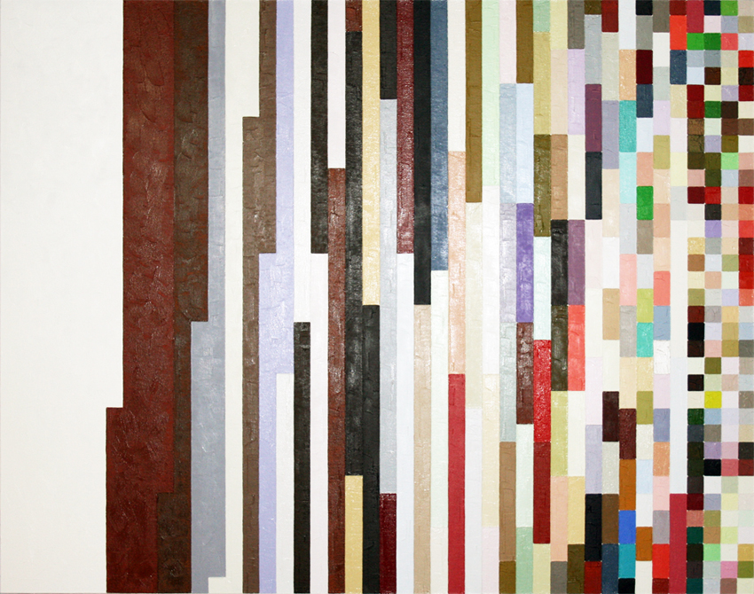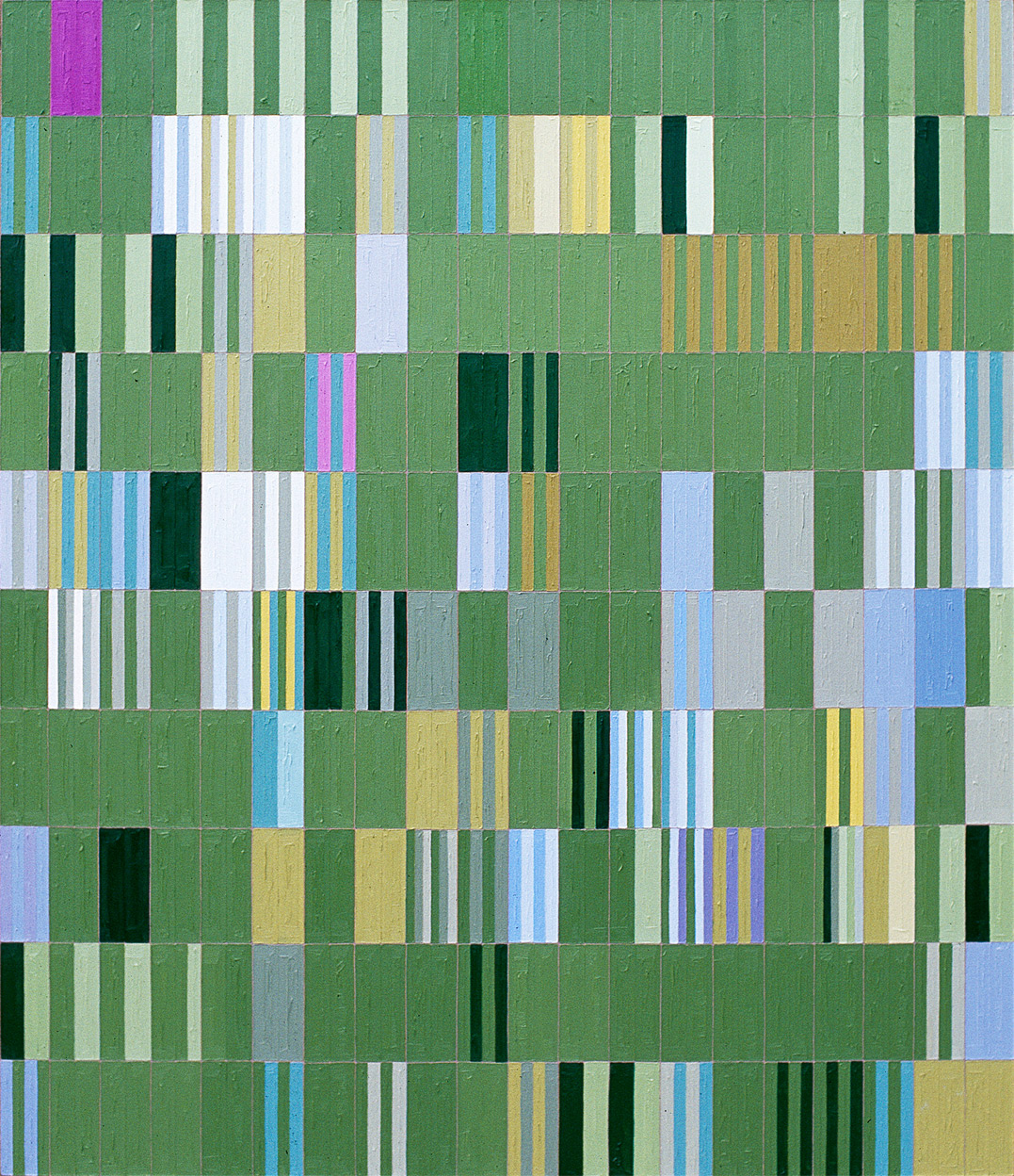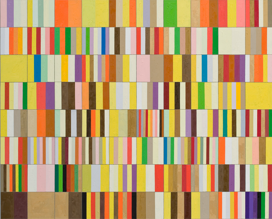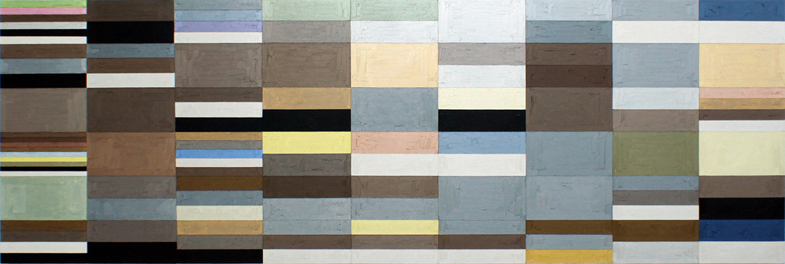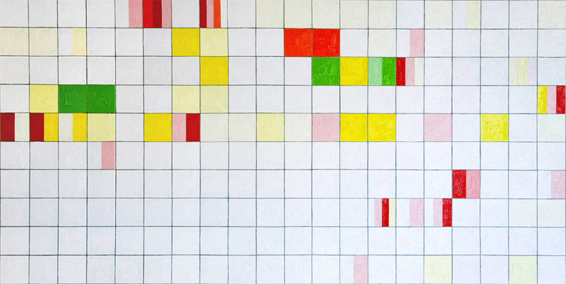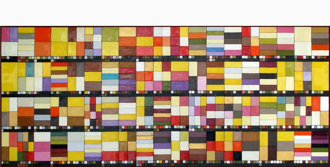 The colour words used to describe and identify the flowers of 200 species of Eucalyptus are painted in squares (10 rows of 20), further divided if a flower has more than one colour word mentioned. The colour words painted are white, creamy white, cream, pale-yellow (including yellowish), yellow, lemon-yellow, pale-pink, pink, pinkish-red, apricot, light-orange, orange, red, pale-green, and yellow-green.