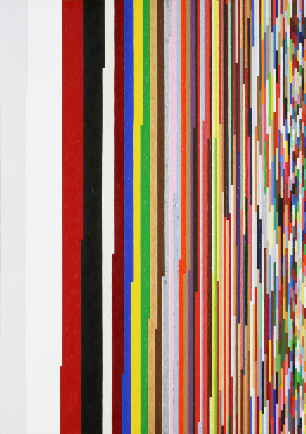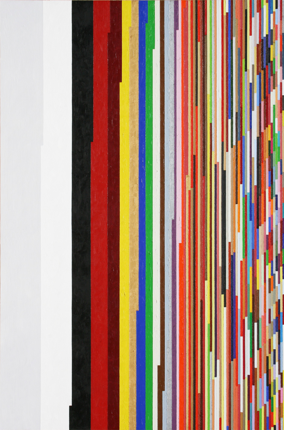 The DEFRAGMENTED LEXICAL SPECTRUMS use the same data and are each the same size as the LEXICAL SPECTRUMS of the same name but instead of colour words per page, they are painted as percentages of the total mentions of each colour word. Each painting begins on the left with the colourless pages, followed by white mentions (the most numerous colour word for all three). They then each go their separate way (ie. red has the second most mentions for APOD and COPD DEFRAGMENTED, but black is the second most numerous colour word for SAPOD DEFRAGMENTED) concluding on the right with colour words mentioned only once.